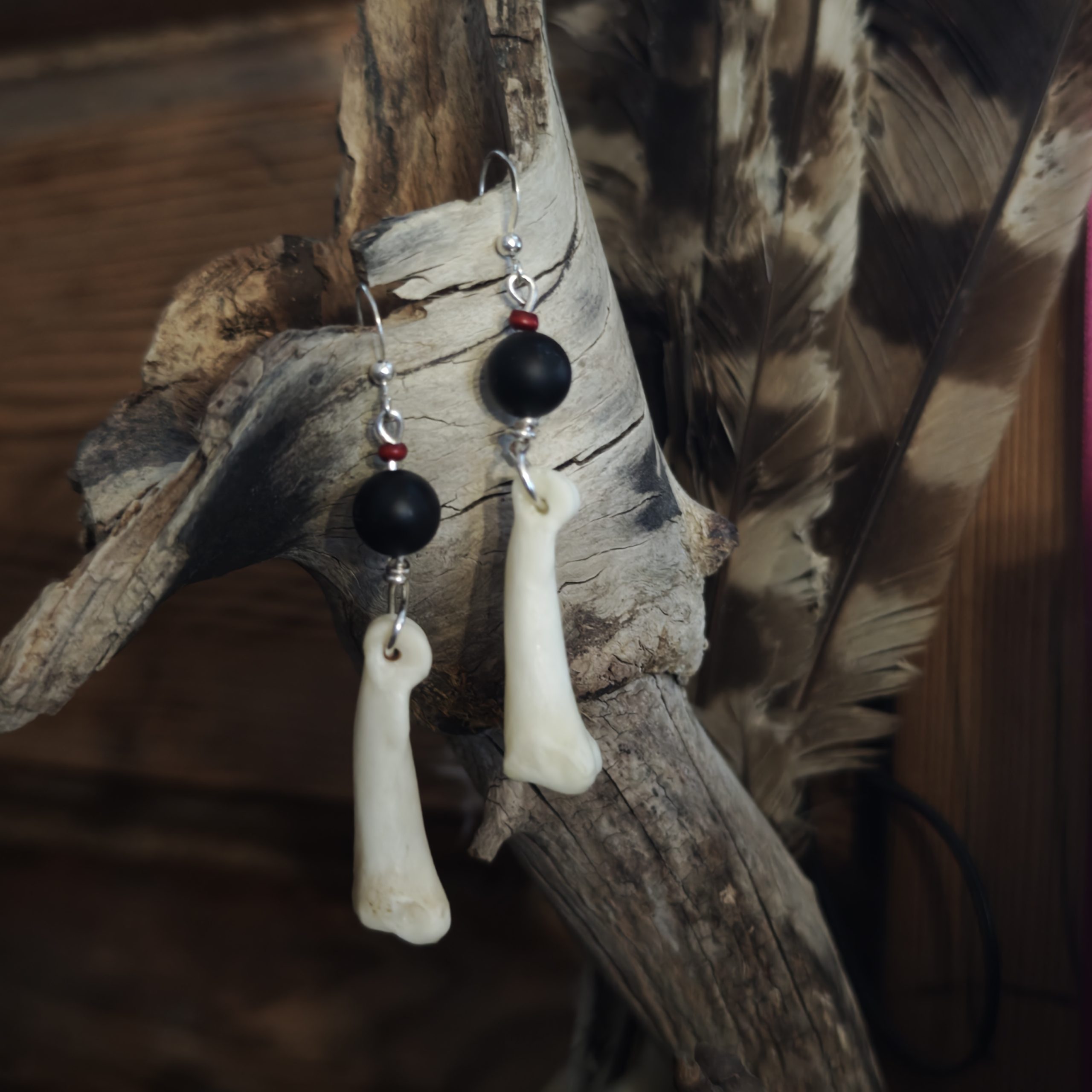 Susi varbaluust kõrvarõngad, musta ahhaadi helmed. Luu pikkus ca 3 cm.