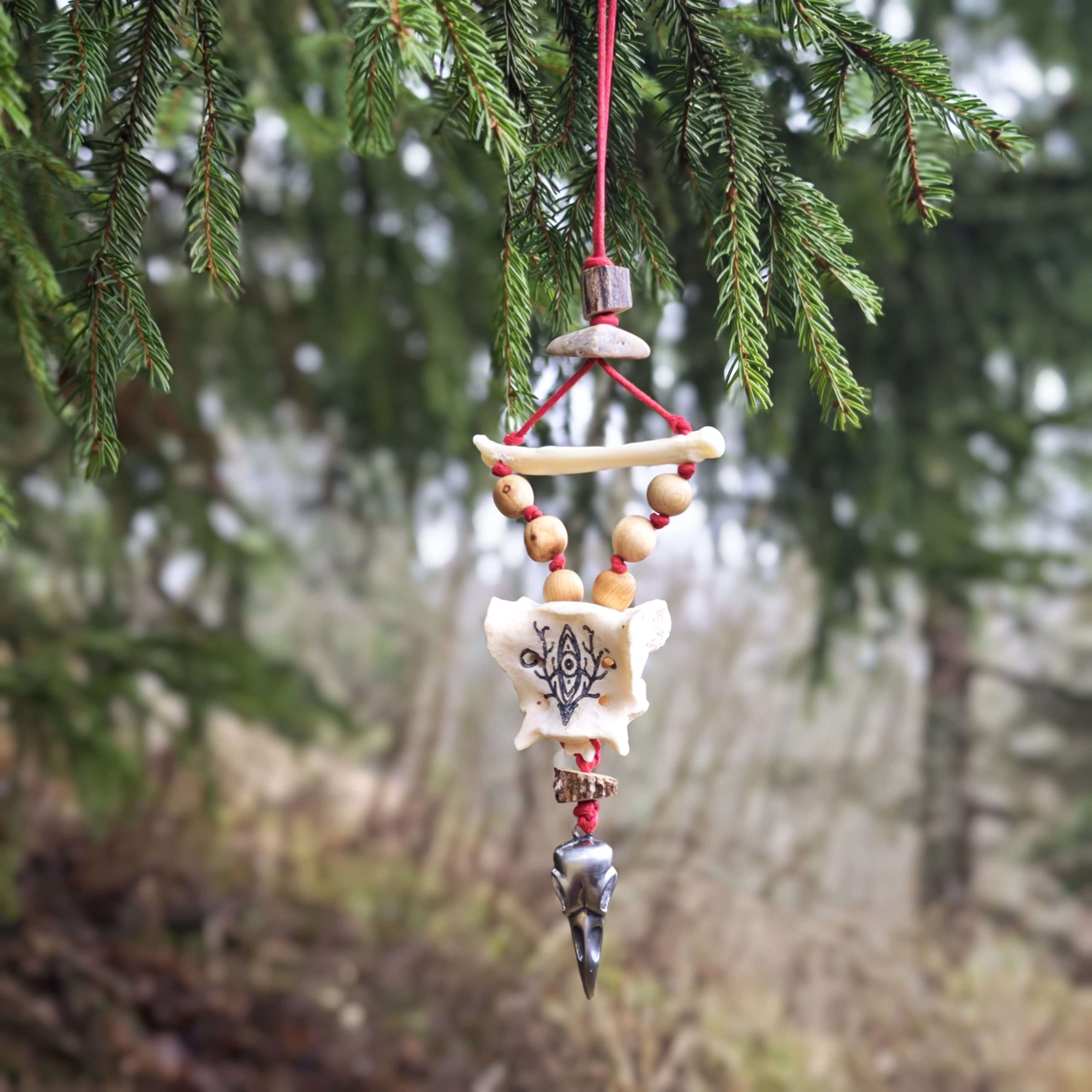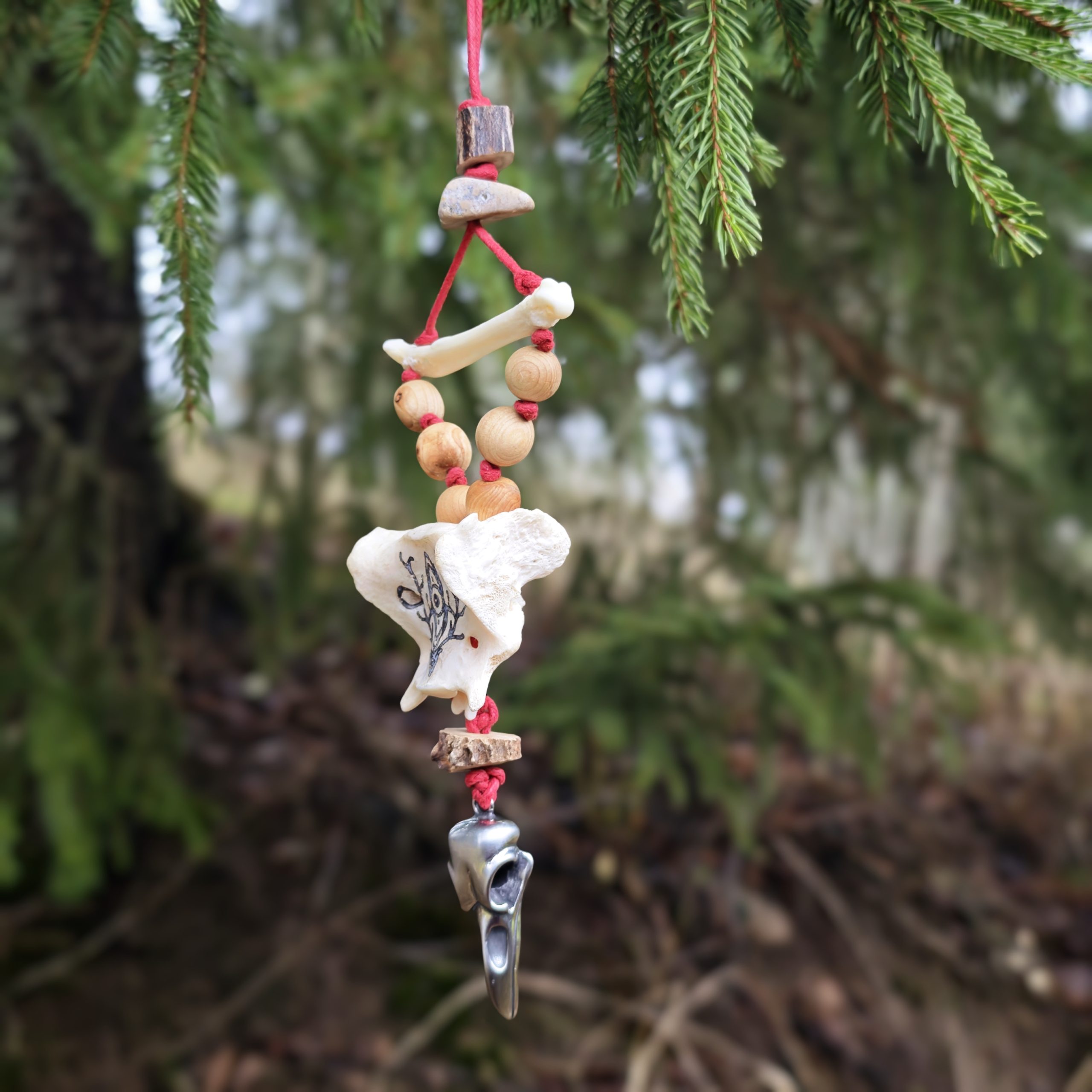 Hundiluule põletatud hoidev silm, kadaka helmed, auguga õnnekivi, metskitse sarve helmed ja metallist ronk. Pikkus ca 22 cm.