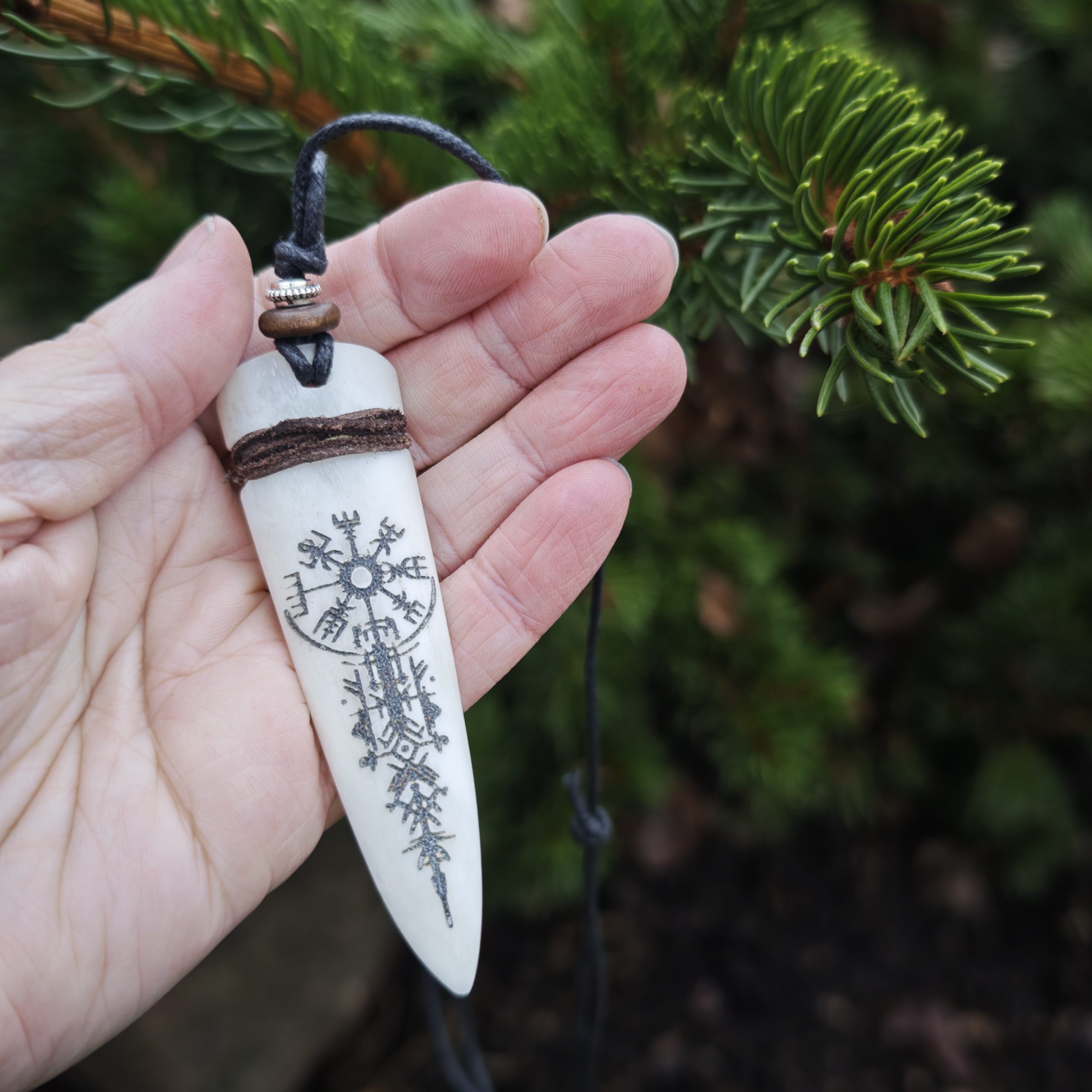 Karuluule põletatud põhjamaine sümbol, vegvisir. Pael reguleeritav, luuripatsi pikkus ca 8,5 cm.