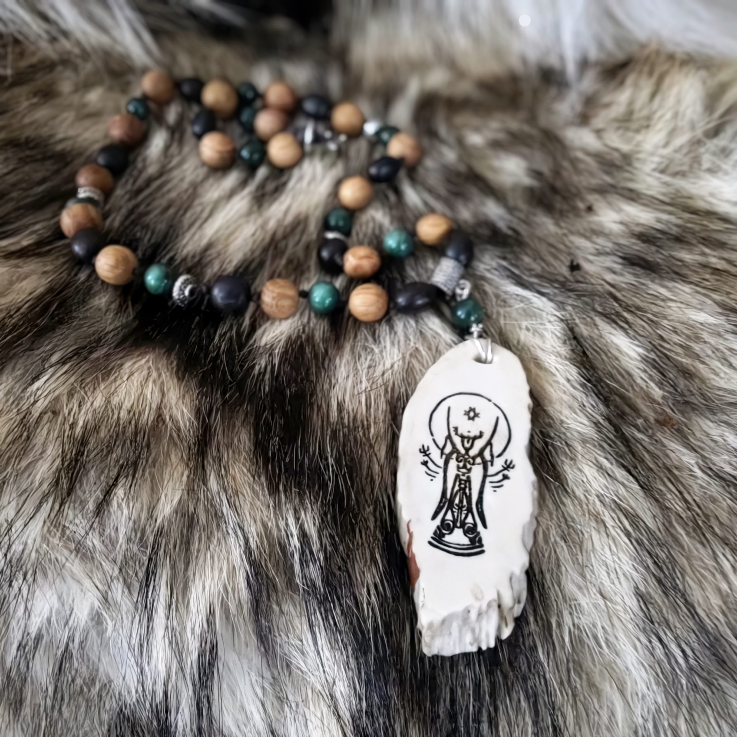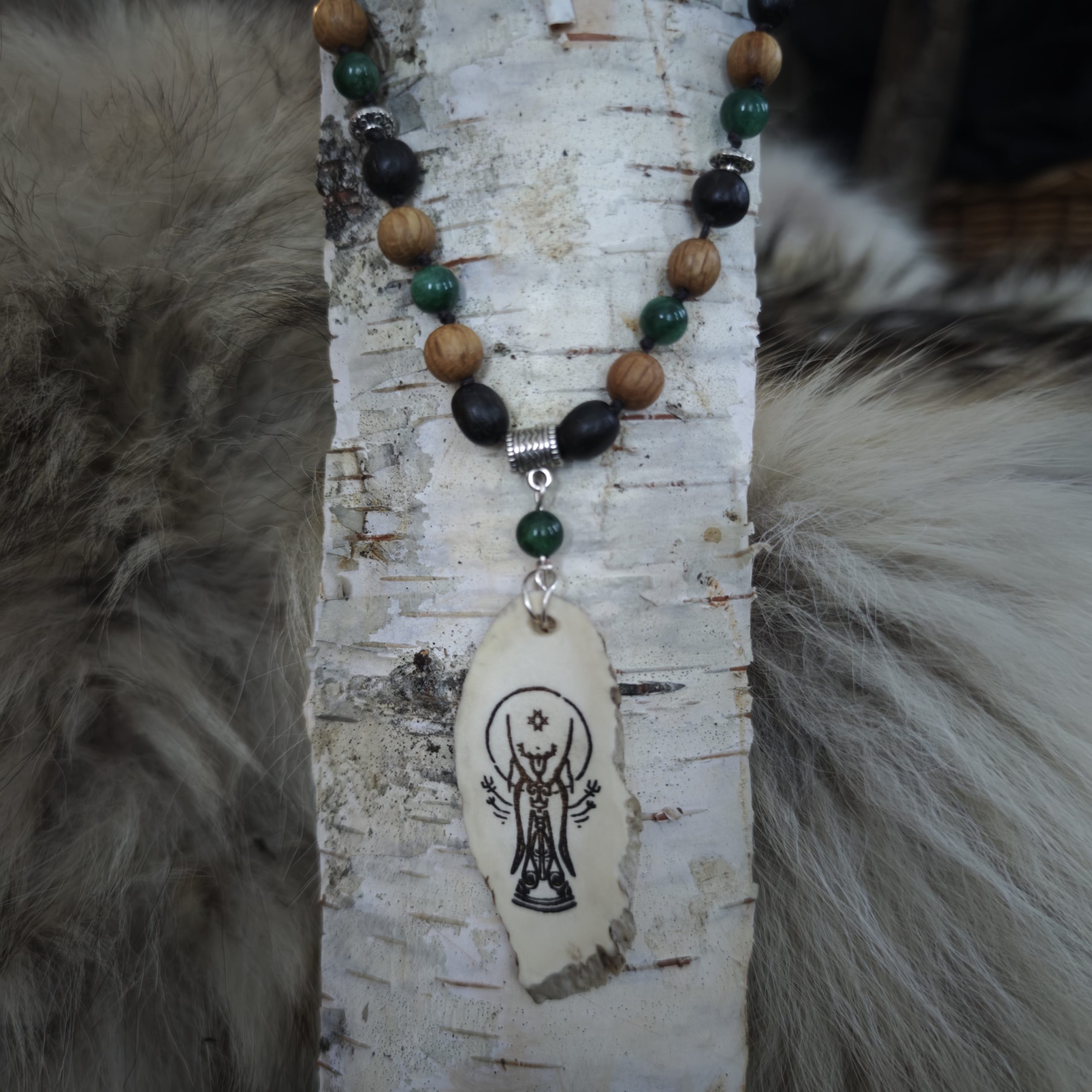 Põdrasarvele põletatud põhjatähe, kaheksakannaga väenaine, maa ja ilmaruumi hoidja. Väekees on tamme, musta tamme ja rohelisi jaadi helmed. Keel on taga haakkinnitus. Helmeste osa pikkus ca 24 cm, sarveripats 7 cm.