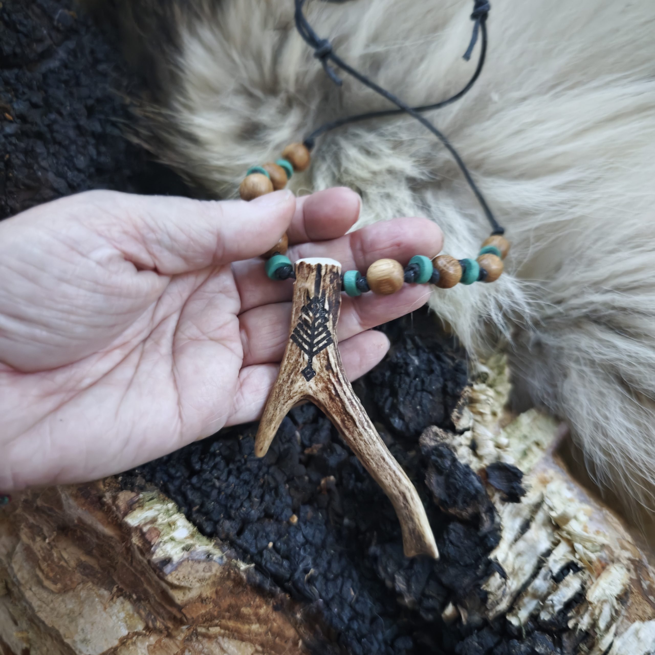 Metskitse sarv, põletatud elupuu sümbol, tammehelmed. Pikkus ca 9 cm
