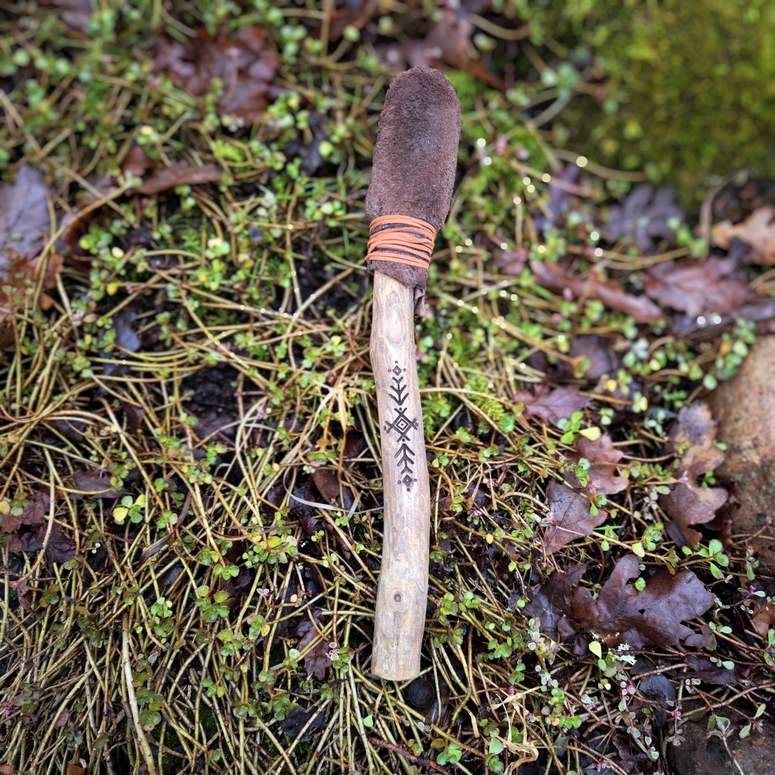 Nahaga kaetud, pehmendatud löömisots, põletatud muster. Pikkus ca 39 cm.