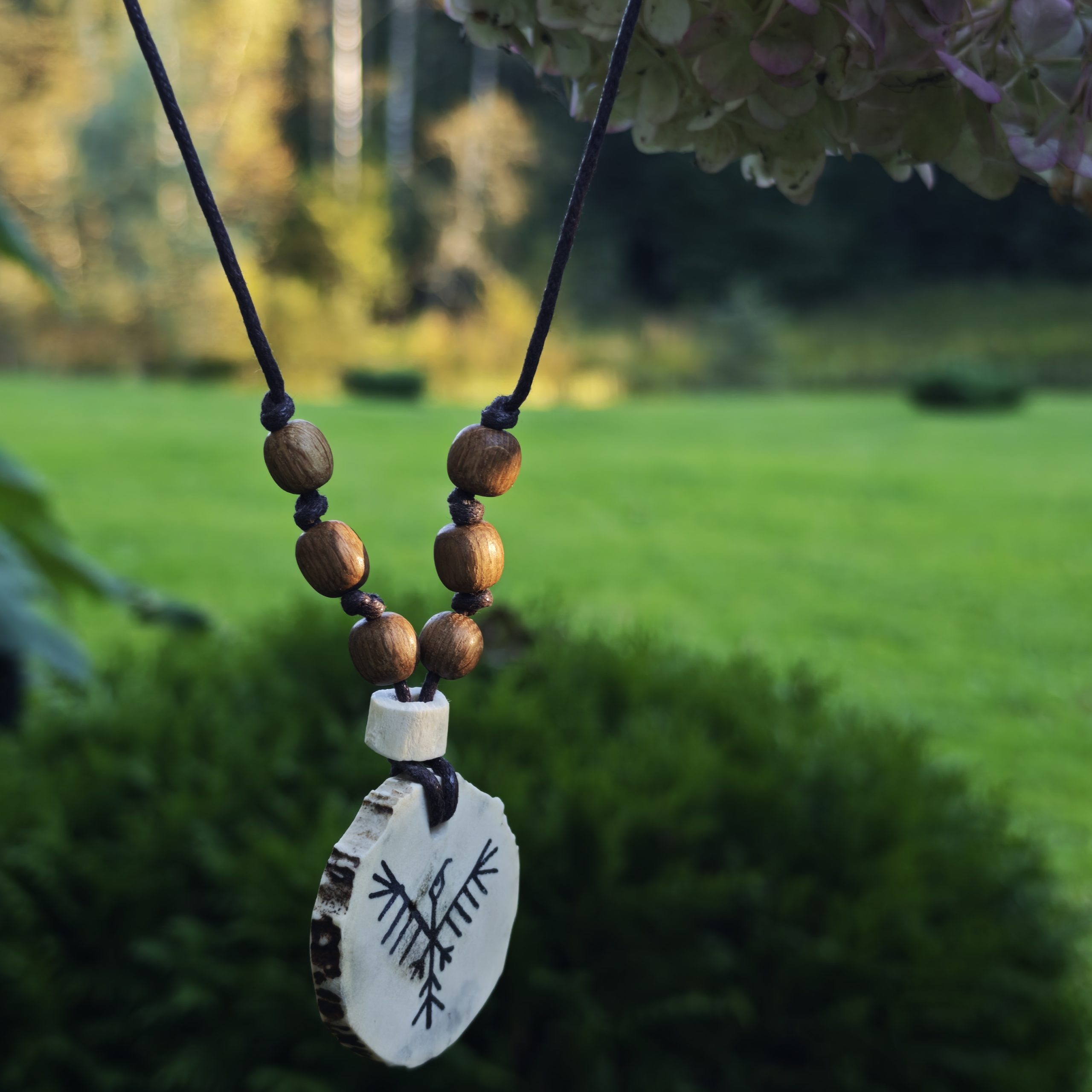 Põdrasarvele põletatud Hingelinnu motiiv. Tammehelmed, hundiluu helmes. Läbimõõt ca 4-4,5 cm.