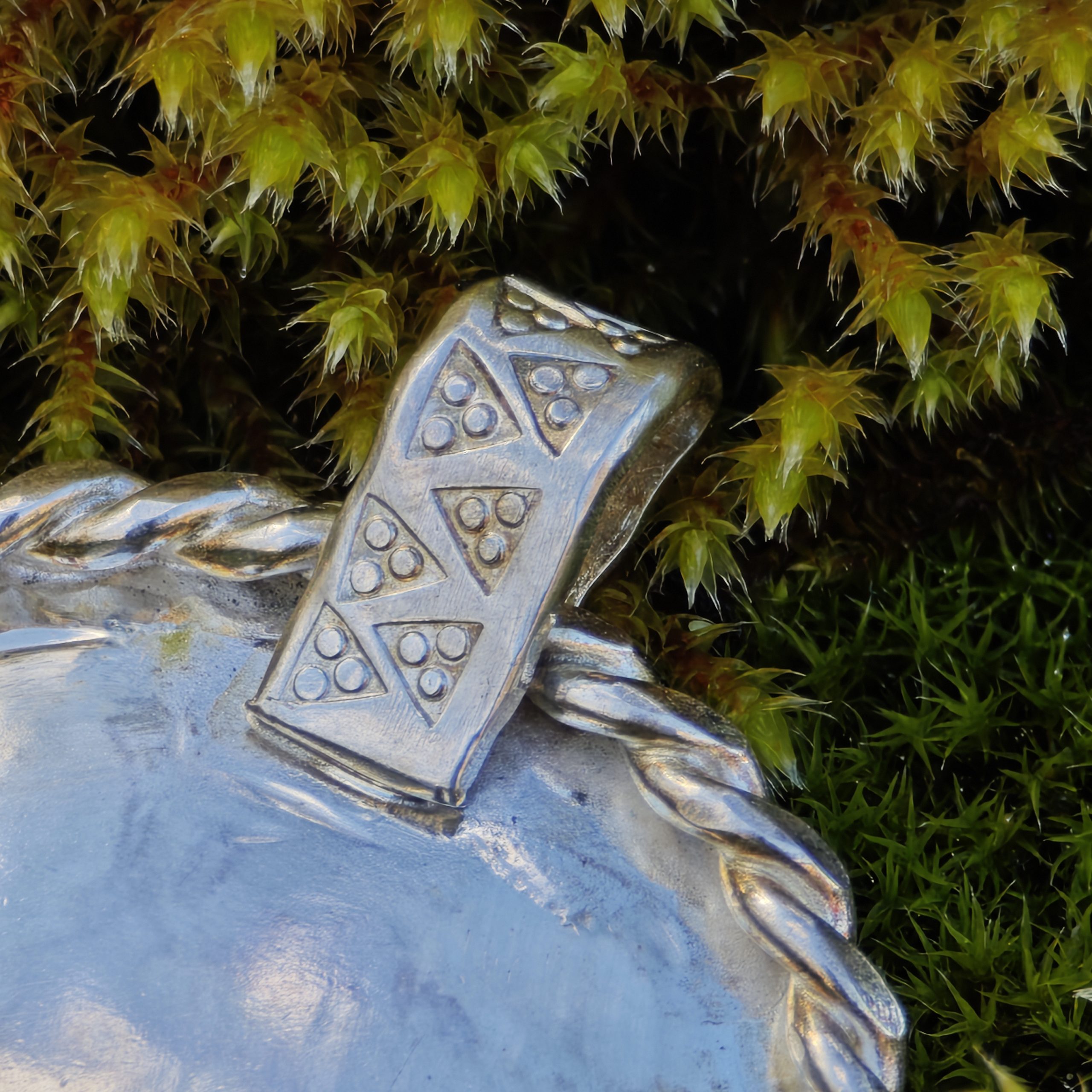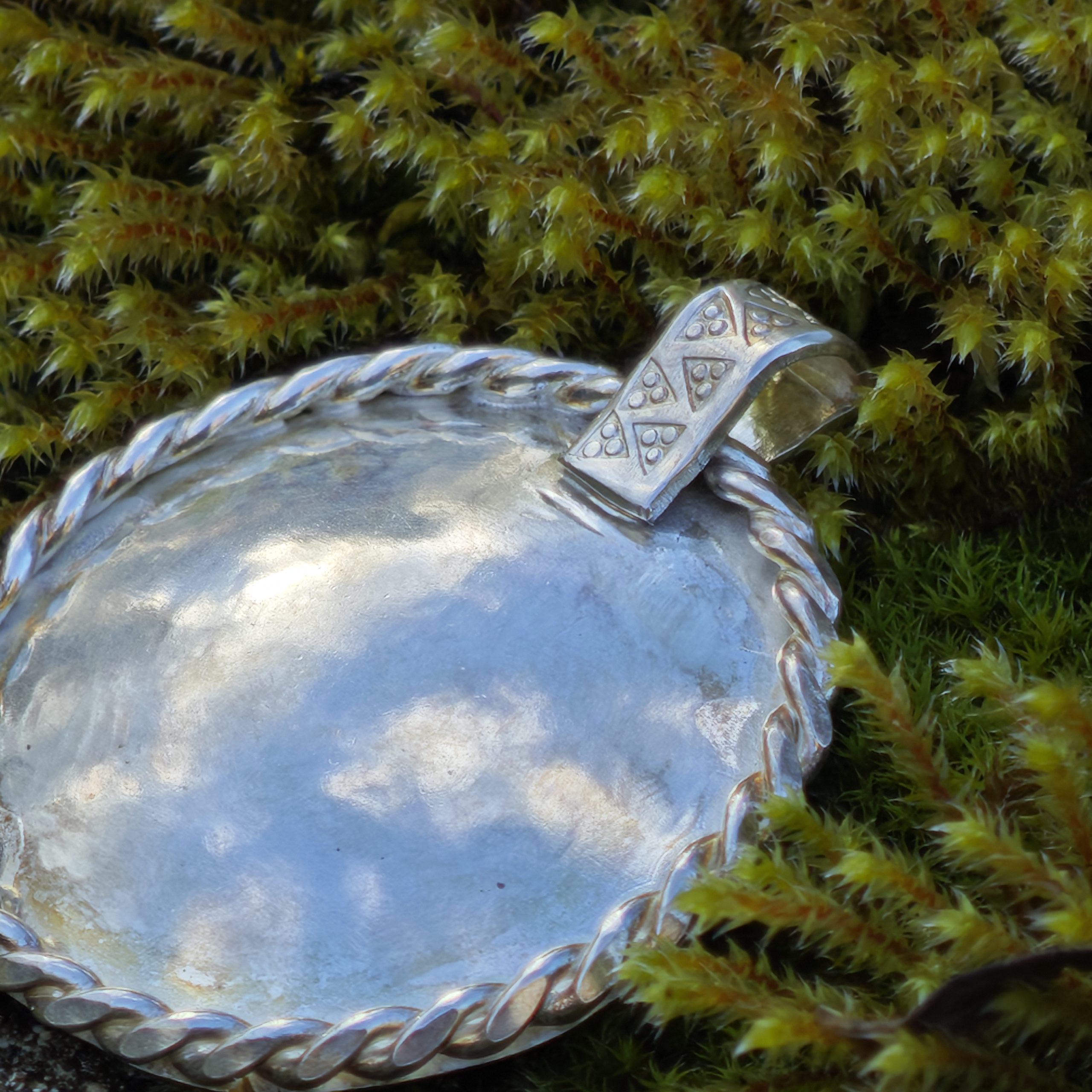 Väike, igapäevane hõbedast peegel – väe atribuut, talisman ravitsejatele, väekandjatele, šamanismi praktikutele. Läbimõõt ca 4 cm, kaal 16-17 gr, hõbe 925°. Riputusaasal on hundihambaornament muster.