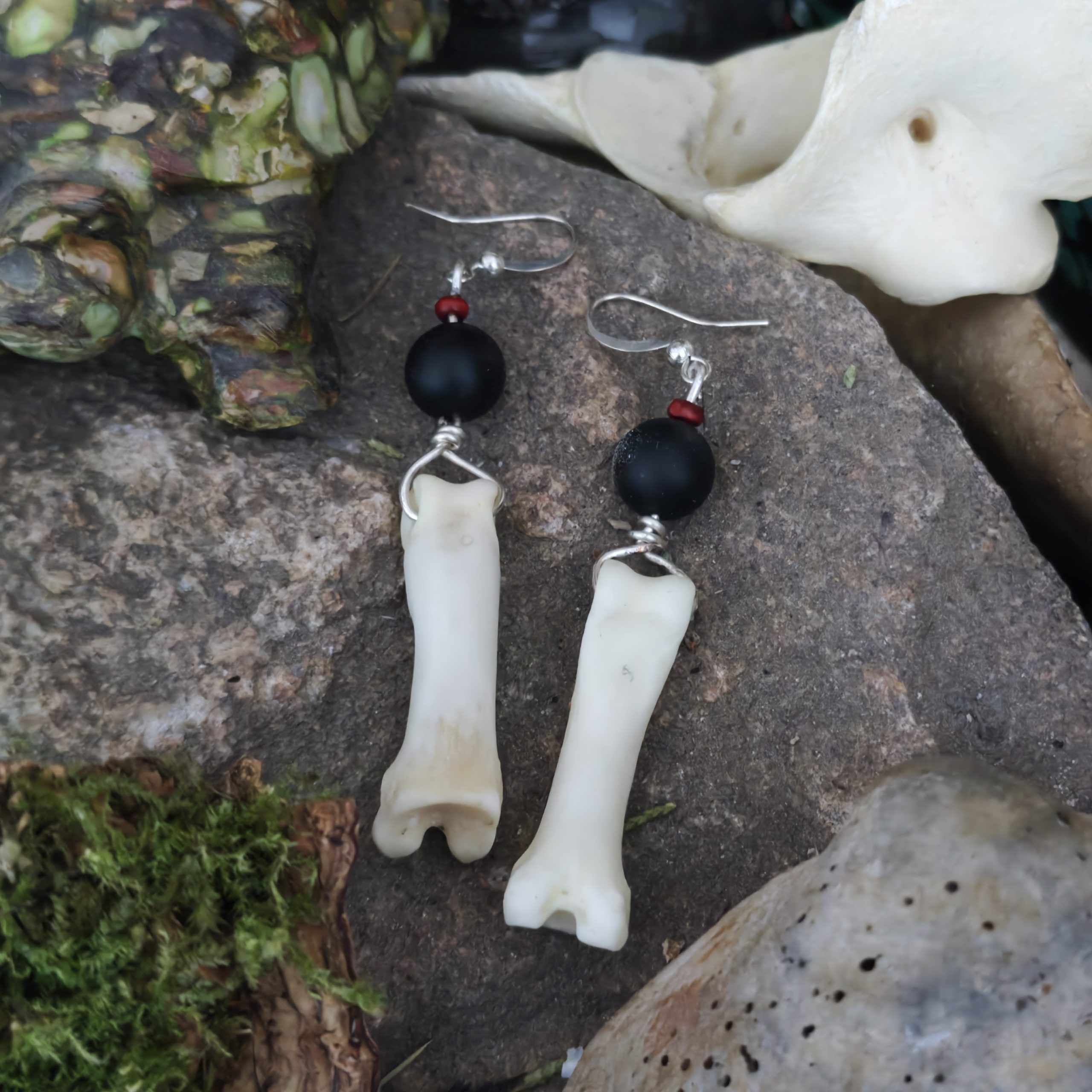 Susi varbaluust kõrvarõngad, musta ahhaadi helmed. Luu pikkus ca 3 cm.