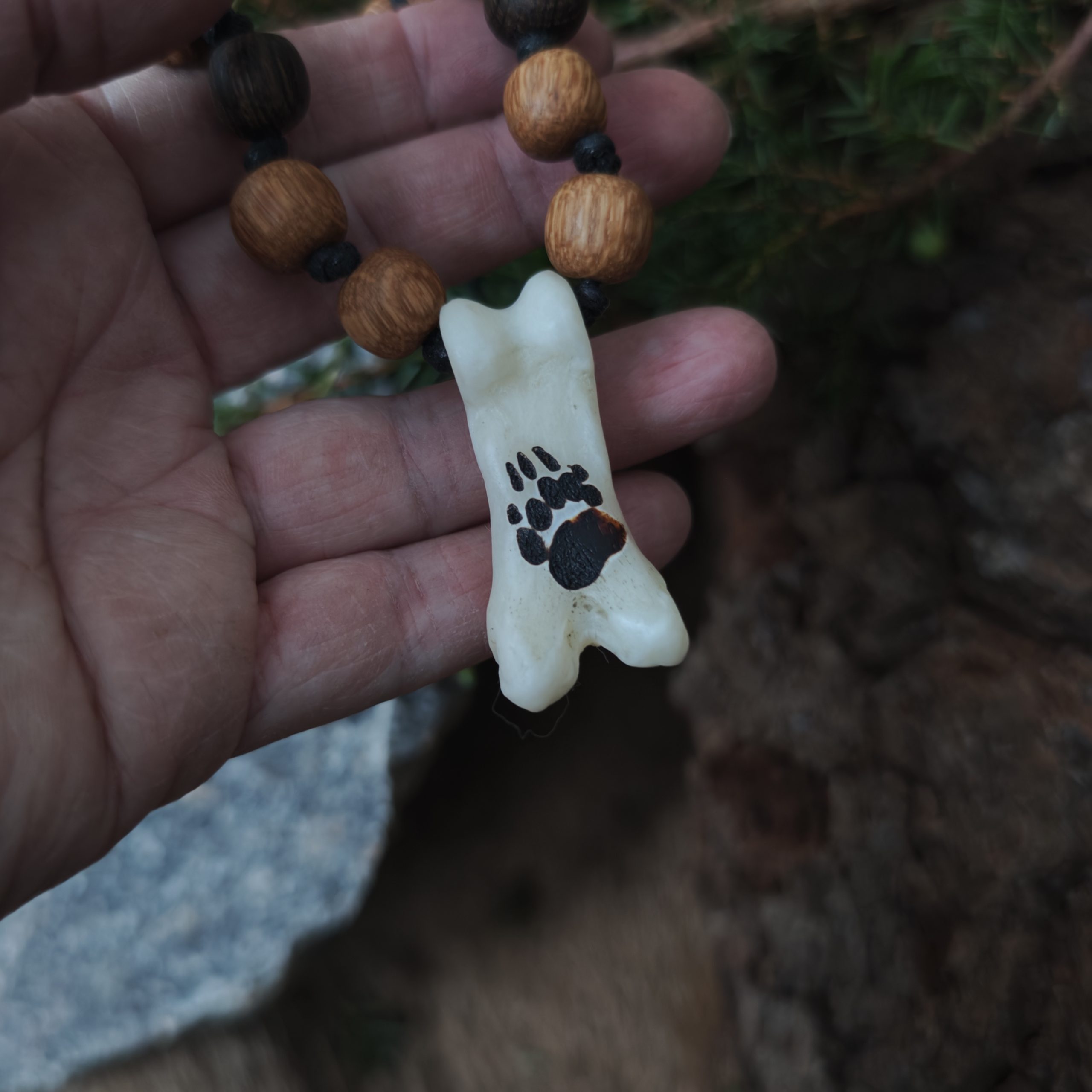 Karu varbale põletatud karu käpajälg. Tamme helmed. Karu varba pikkus ca 4,2 cm.