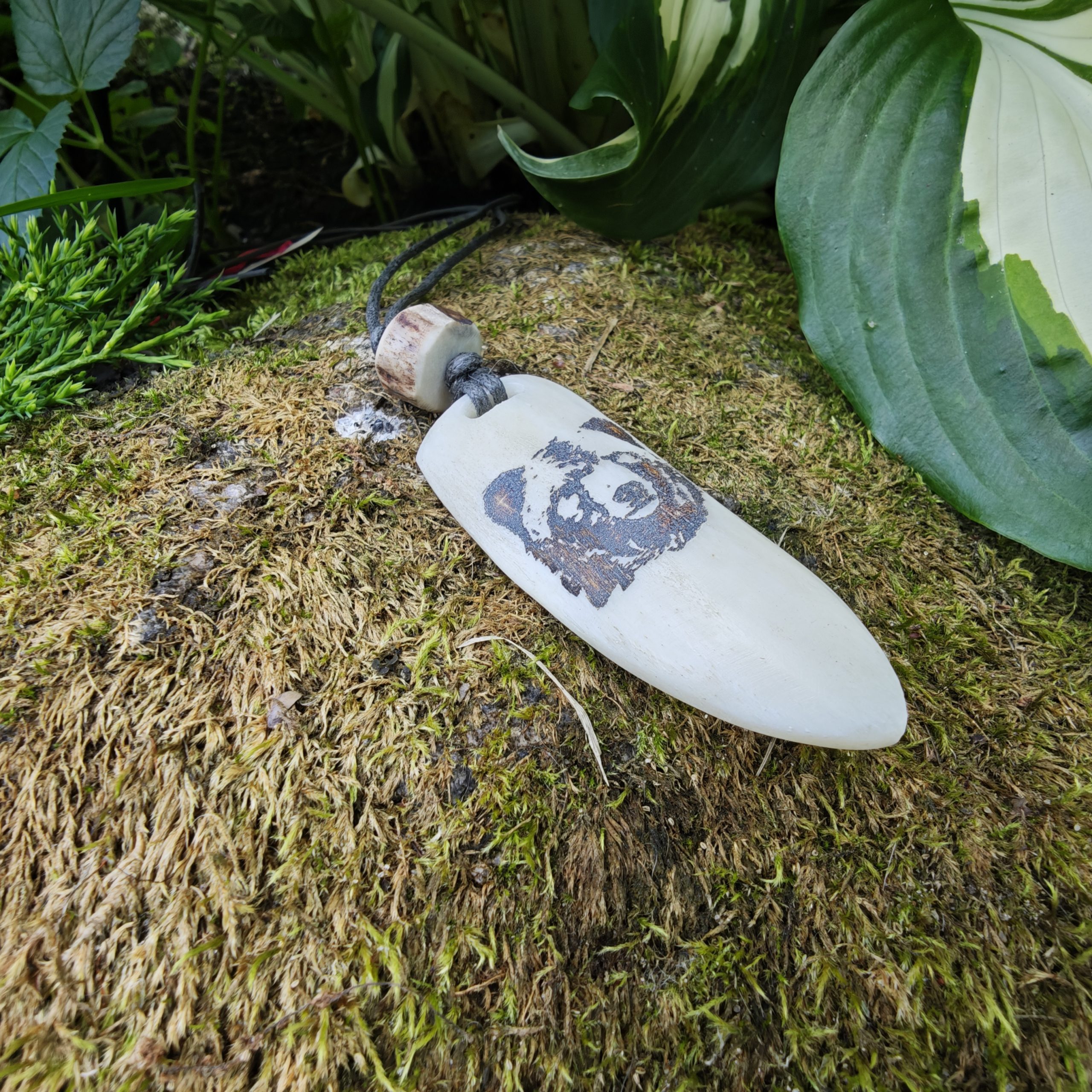 Karu luust amulett, põletatud karu sümboolikaga. Lisaks kitsesarvest helmes. Ripatsi suurus ca 6,5cm.