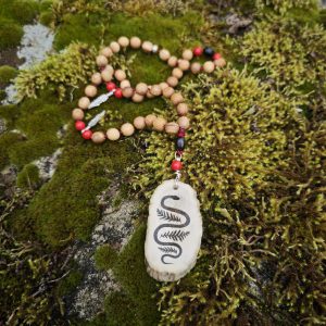 Põdraluule põletatud ussidega kõrvarõngad, punane kinaver. Kõrvarõngaste pikkus koos helmega ca 6,5 cm.