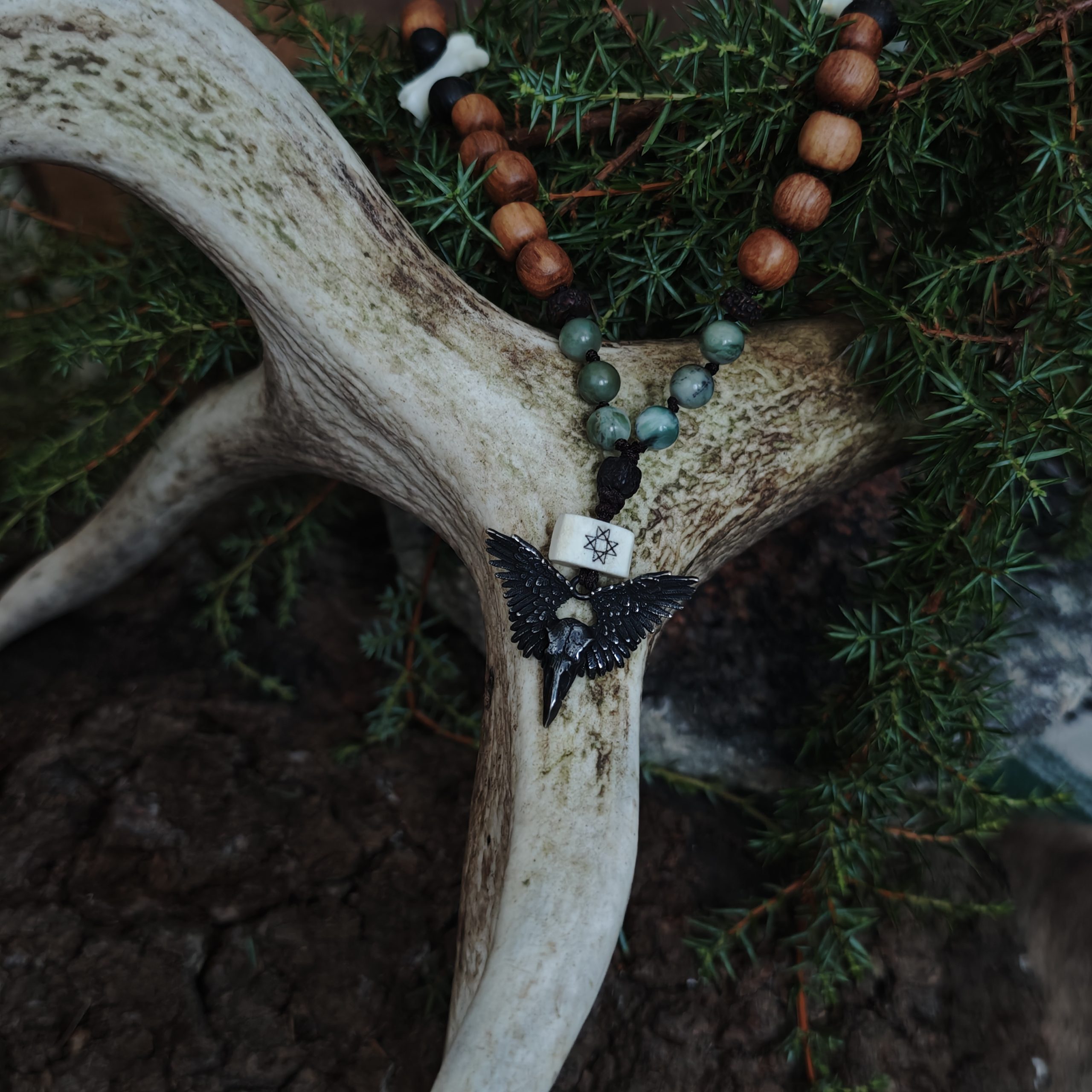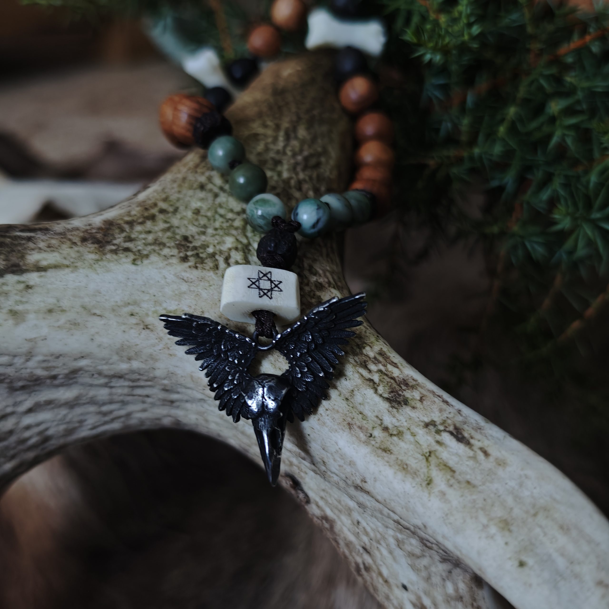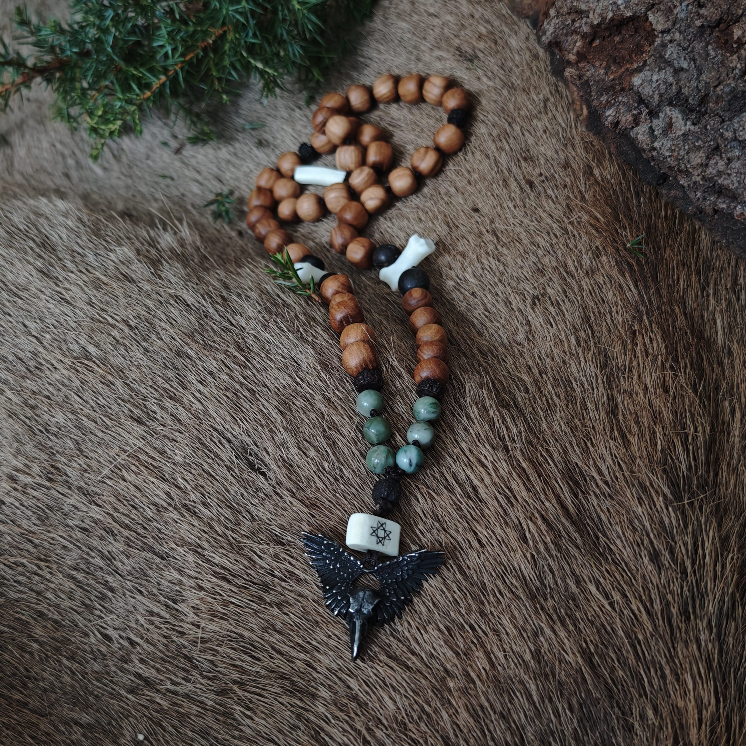 Ronga ja susi vägi. Hundiluud, saarepuu ja musta tamme helmed. Roheline jadeiit, metallist ronk. Hundiluule põletatud kaheksakand, põhjatäht. Helmeste osa pikkus 34 cm (78 cm täispikkus). Talismani võib kanda kaelas, aga riputada ka koju, autosse, töökohale kaitseks ja hea õnne loomiseks.