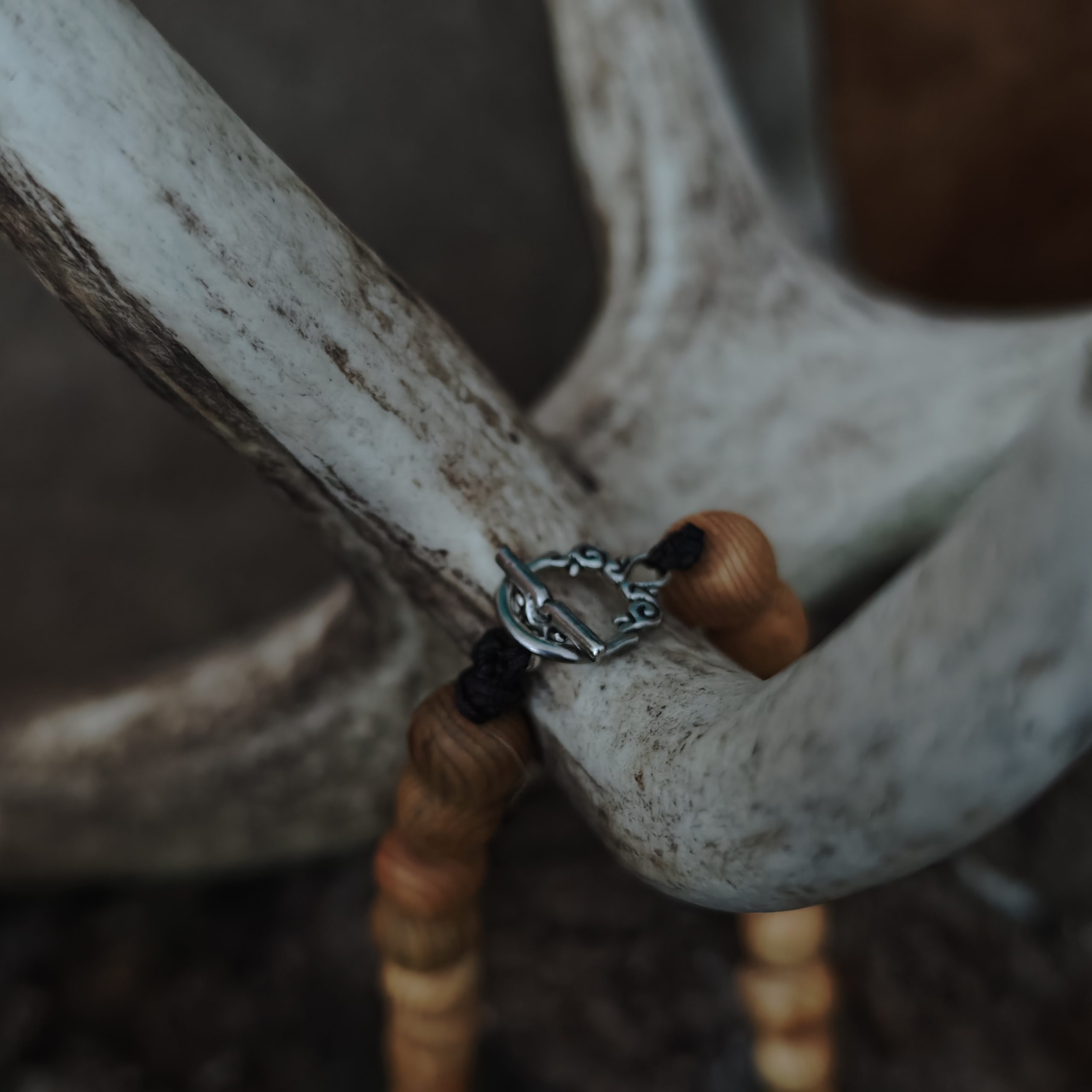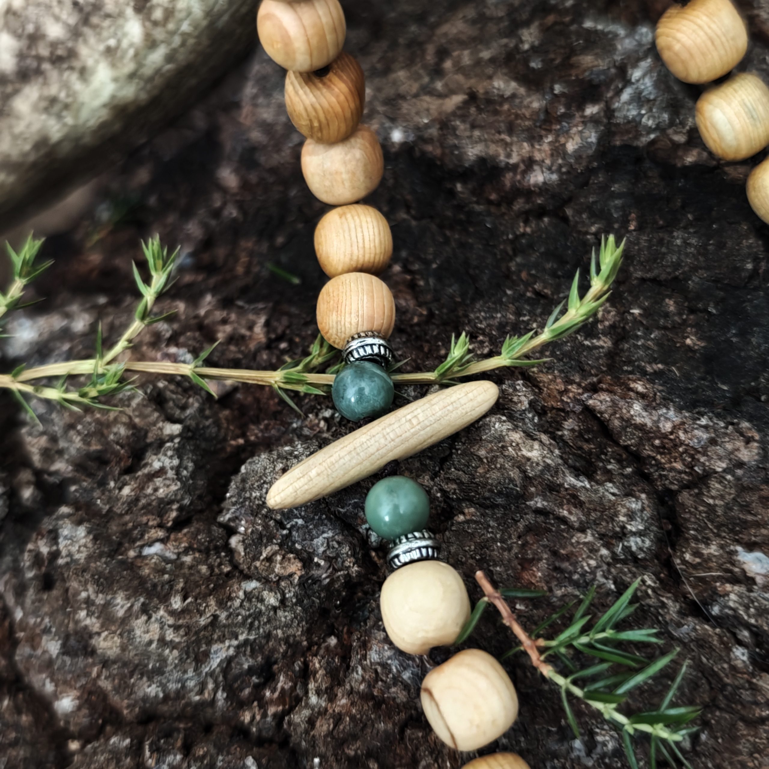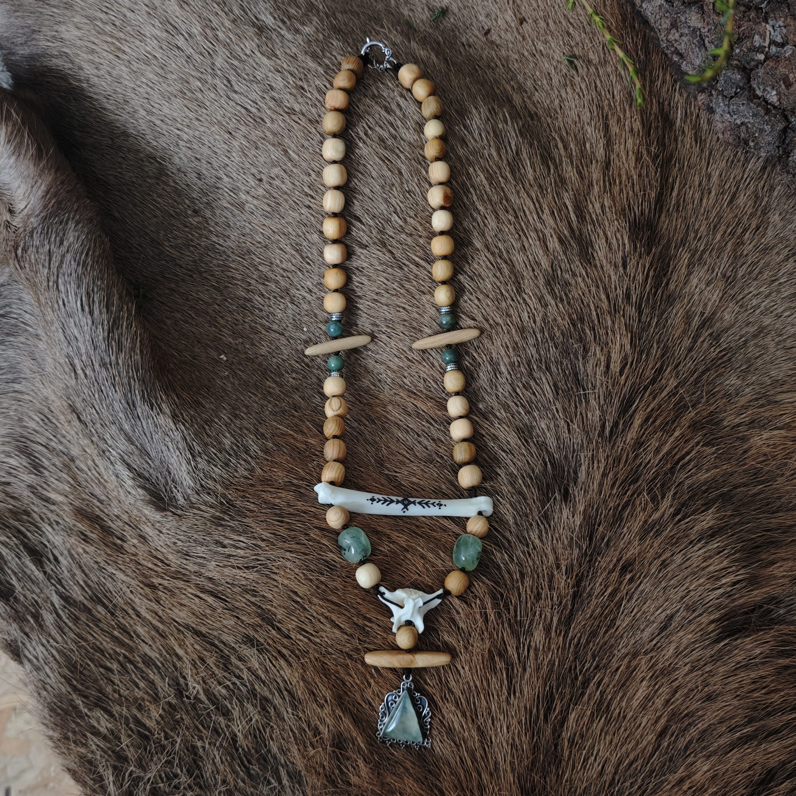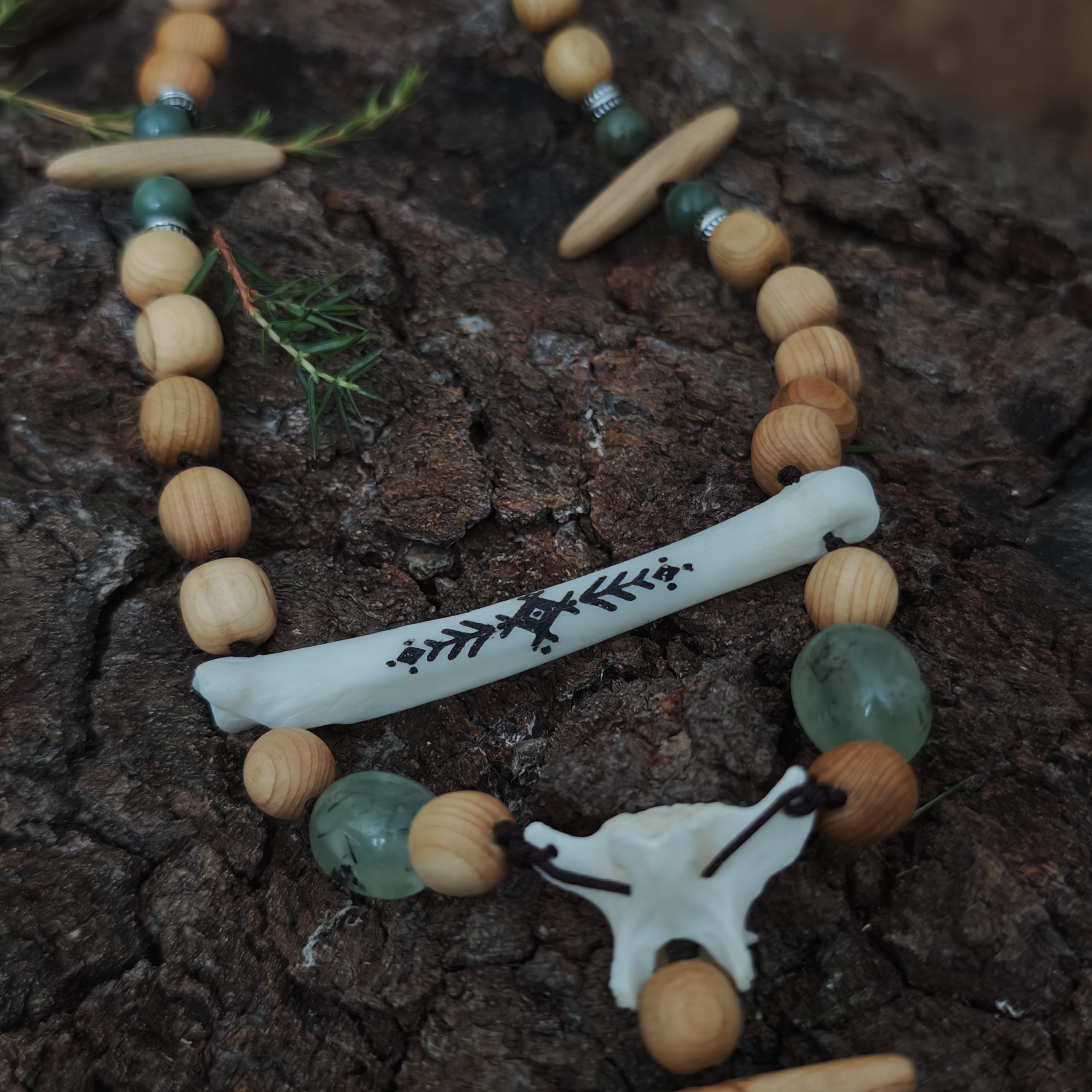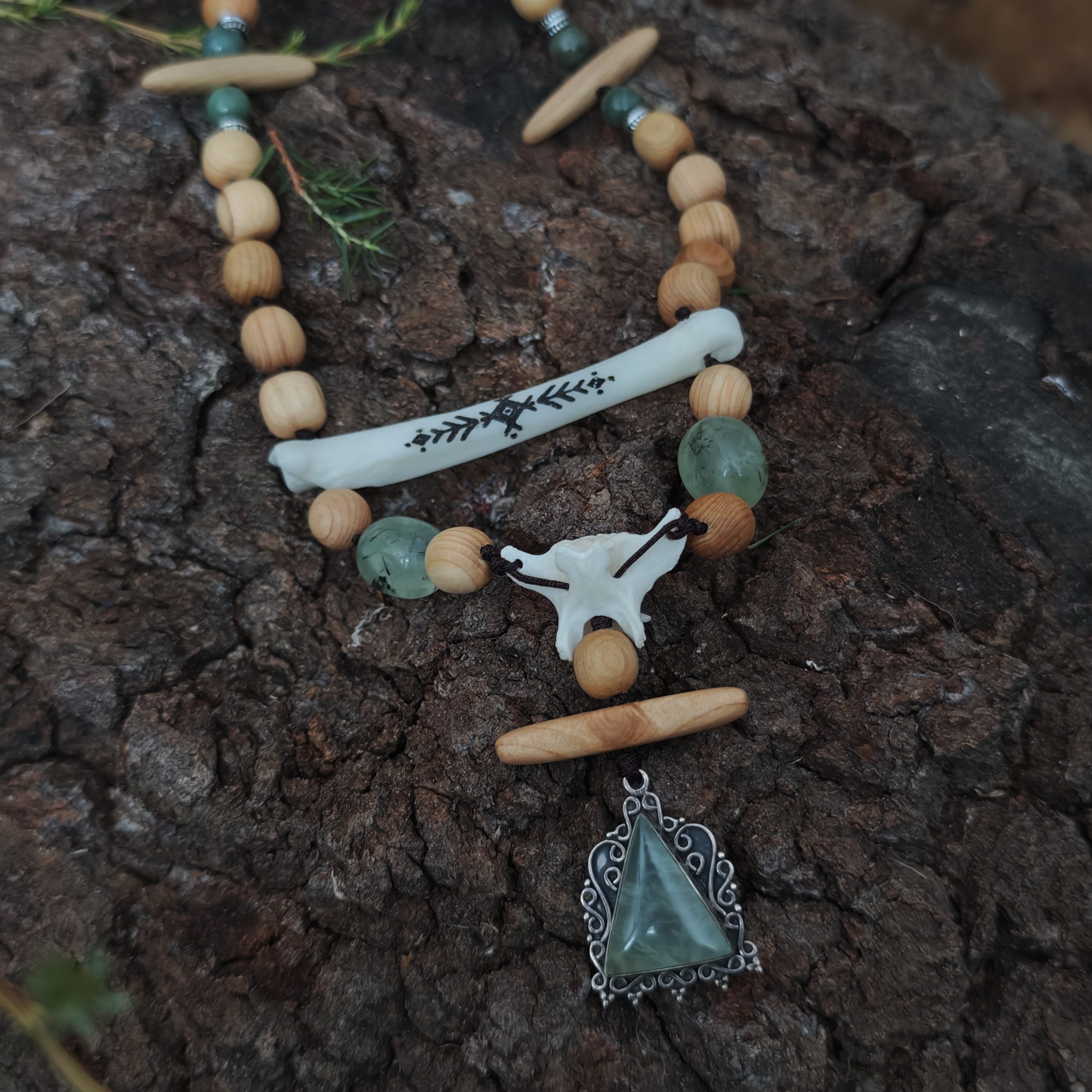 Väekas metsane kee tugevama loodusühenduse hoidmiseks. Hundiluu, kadakas, preniit, ripats on hõbedane, aventuriiniga. Muster on hundiluule põletatud.