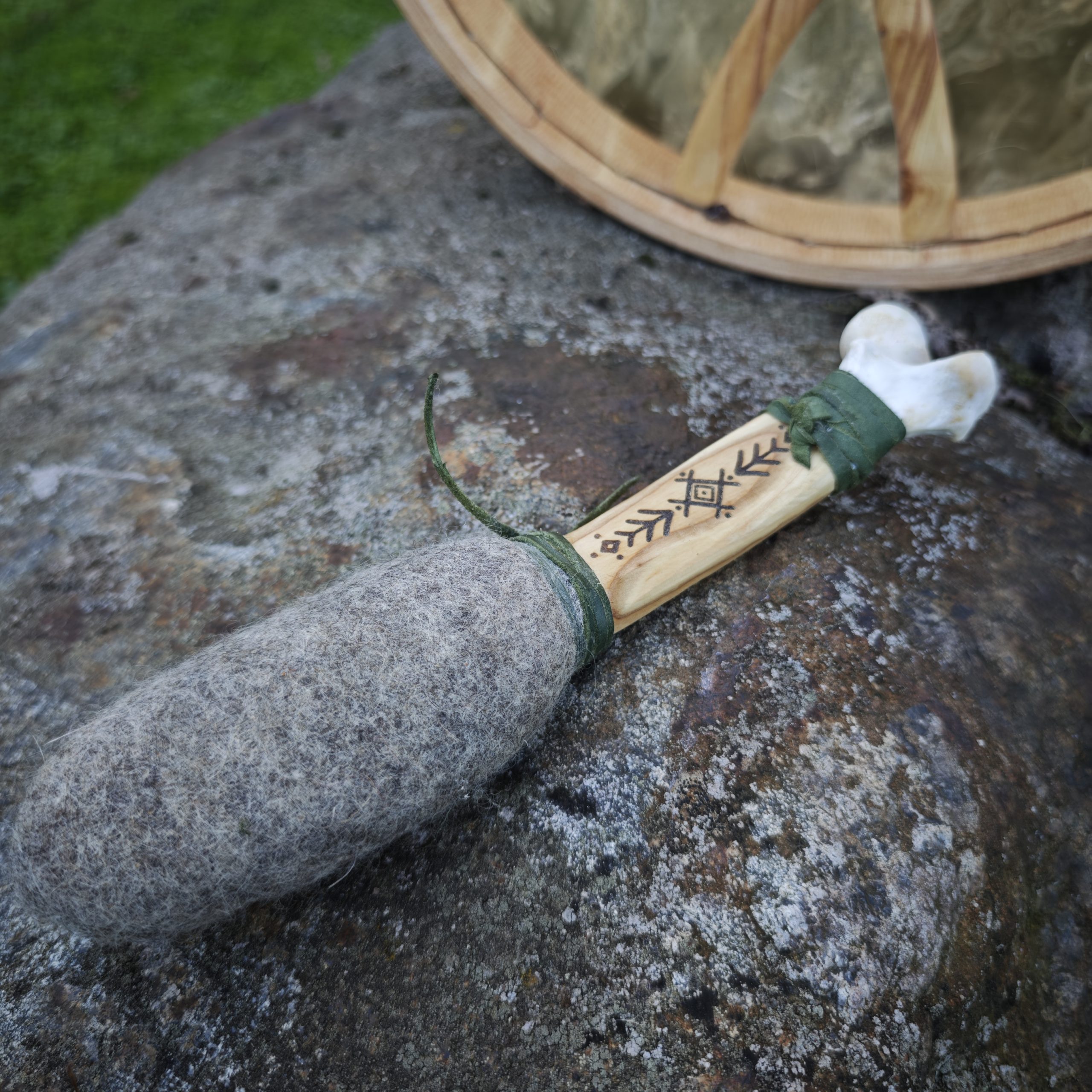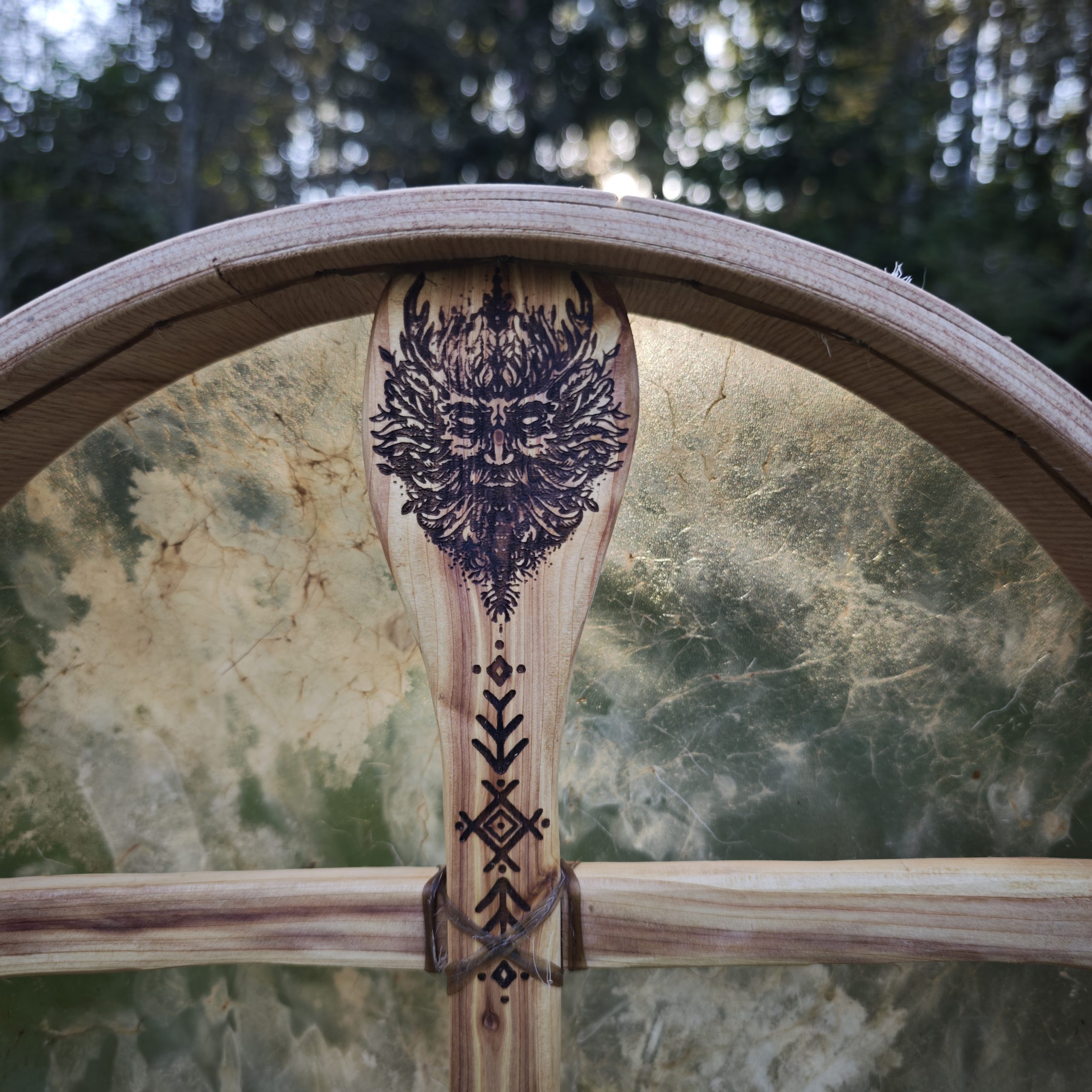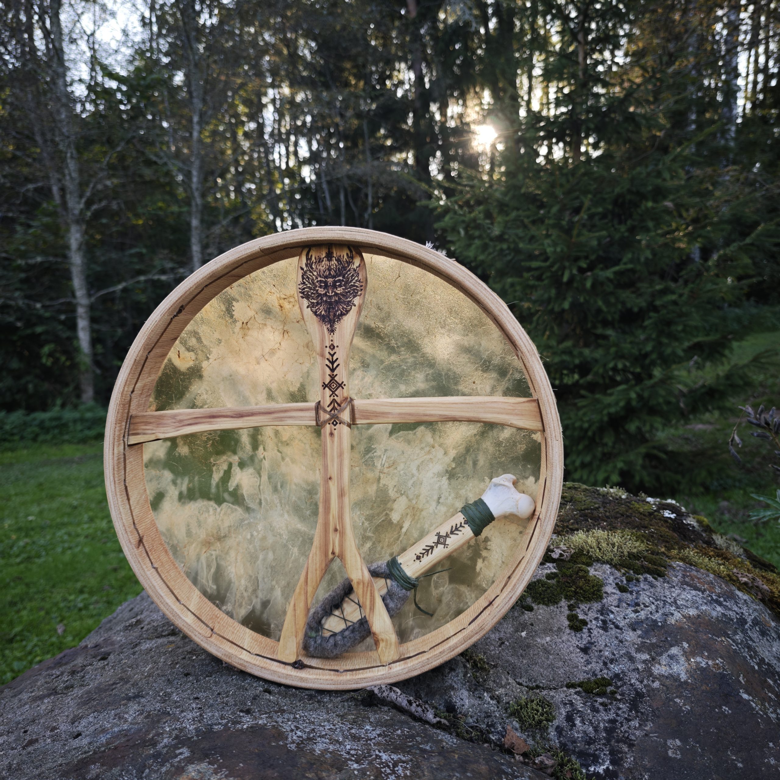 Hirvenahast trumm. Valminud kasvava kuu väes, nagu täiskuu oma laikudega ja varjudega. Ja tahtis olla hirvesarvedega metsavaim, nii sai ta kadakasele käepidemele põletatud.