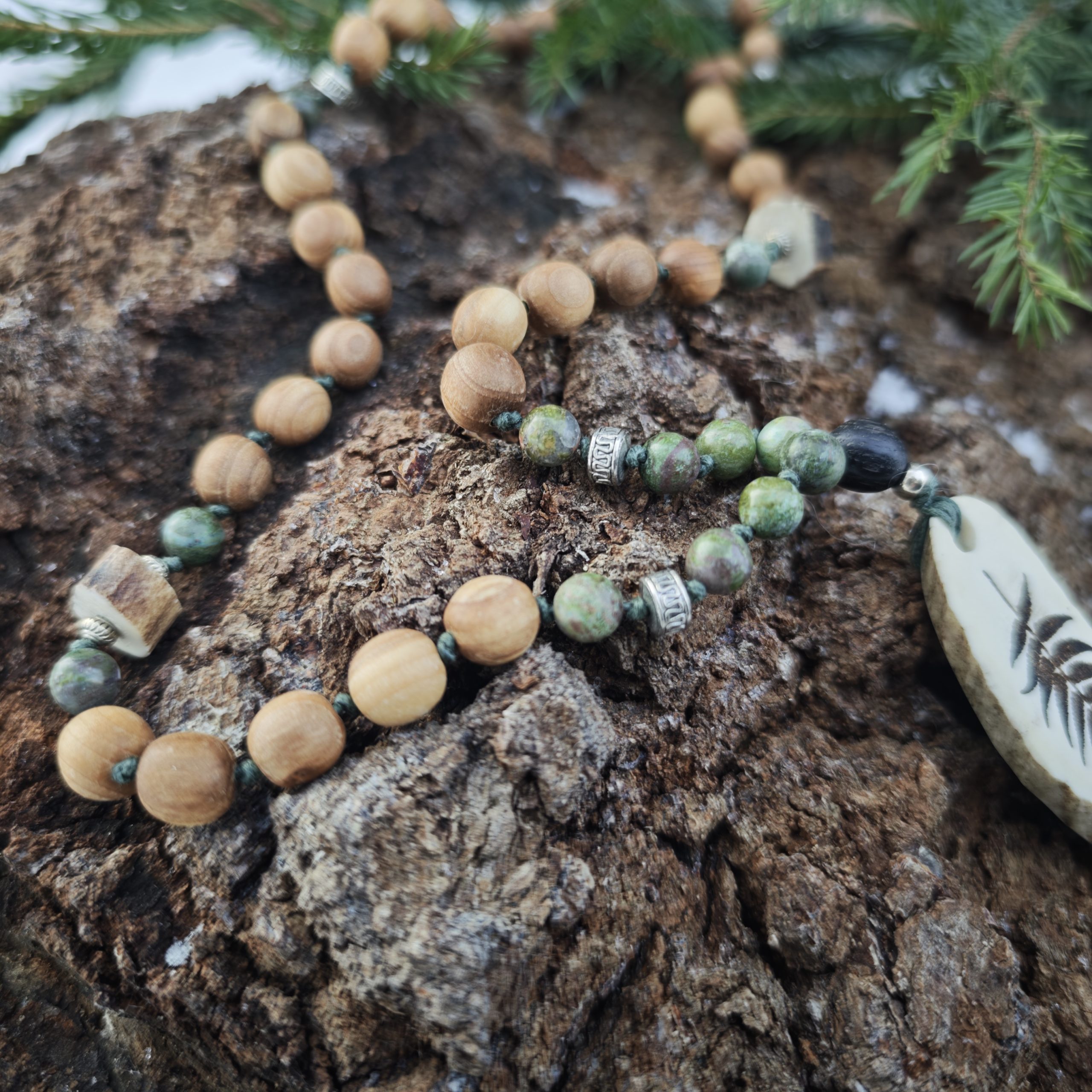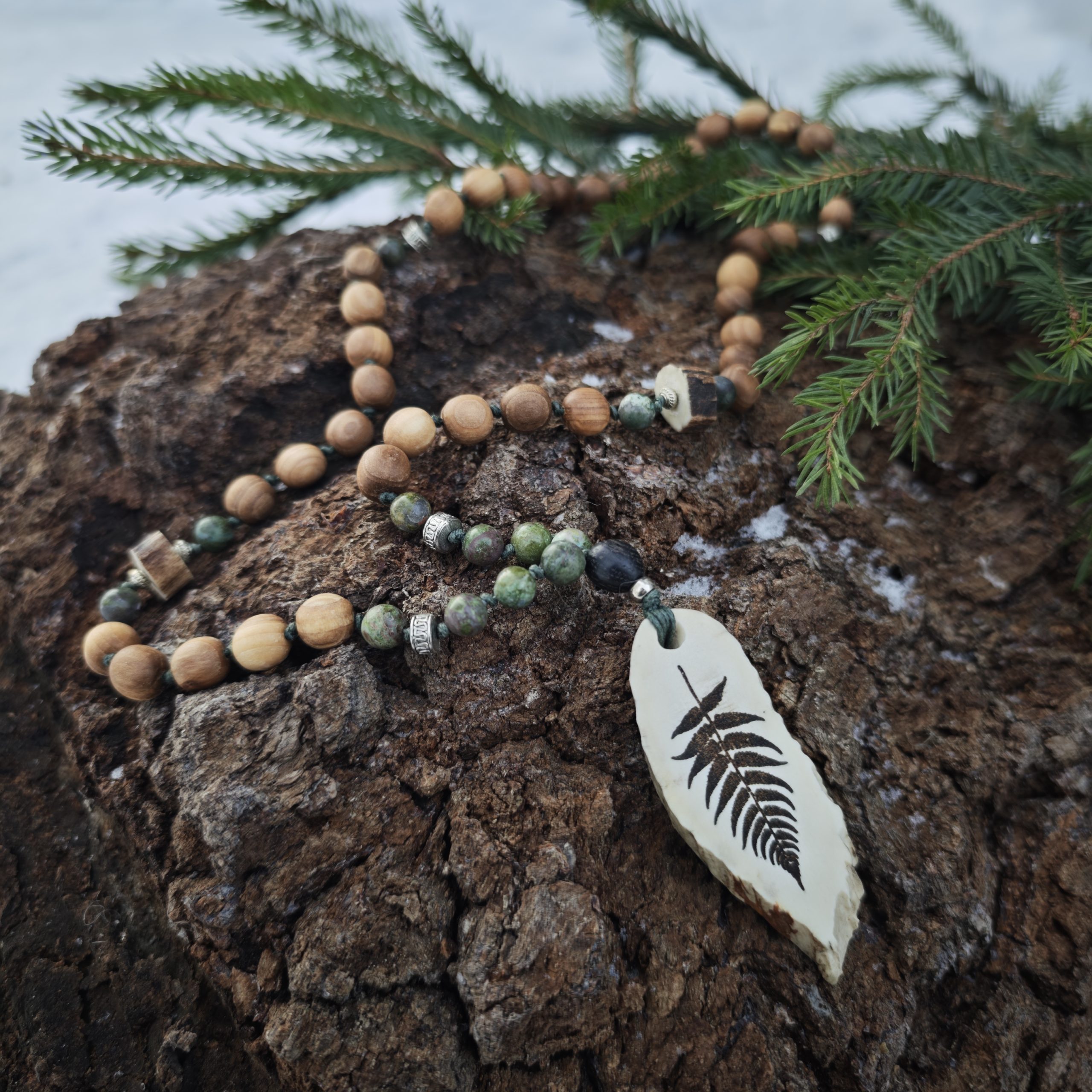 Taas üks metsasarjast väekee. Põdrasarvele põletatud puuleht/sõnajalaleht. Pihlaka, musta tamme, metskitse, unakiiti helmed. Helmestega osa pikkus kaelas ca 35 cm (kogupikkus 70). Sarveripats 7,2 cm.