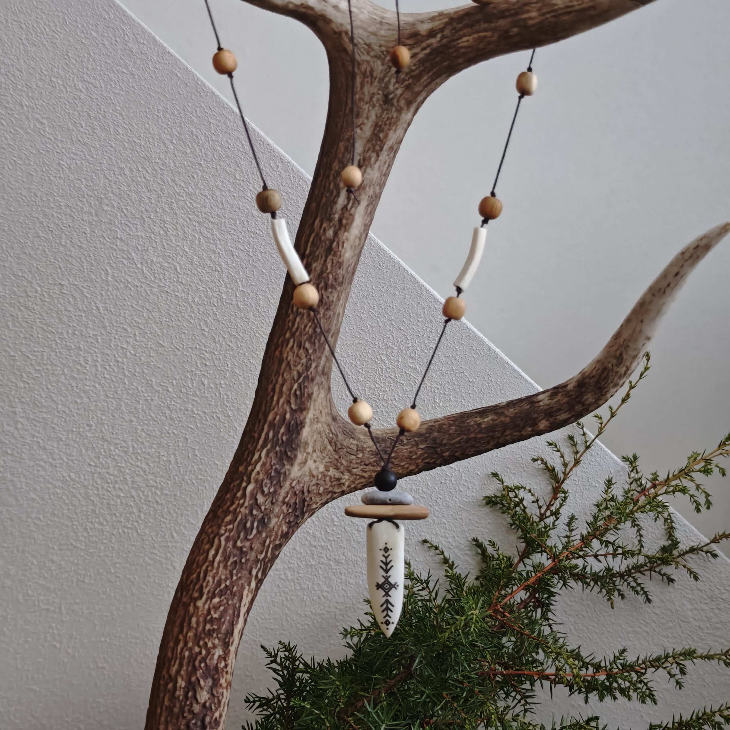 Hundiluule põletatud väemuster, kadakapuu, must tamm, auguga õnnekivi. Kogu väekee pikkus koos ripatsiga 42 cm (65 cm keed).