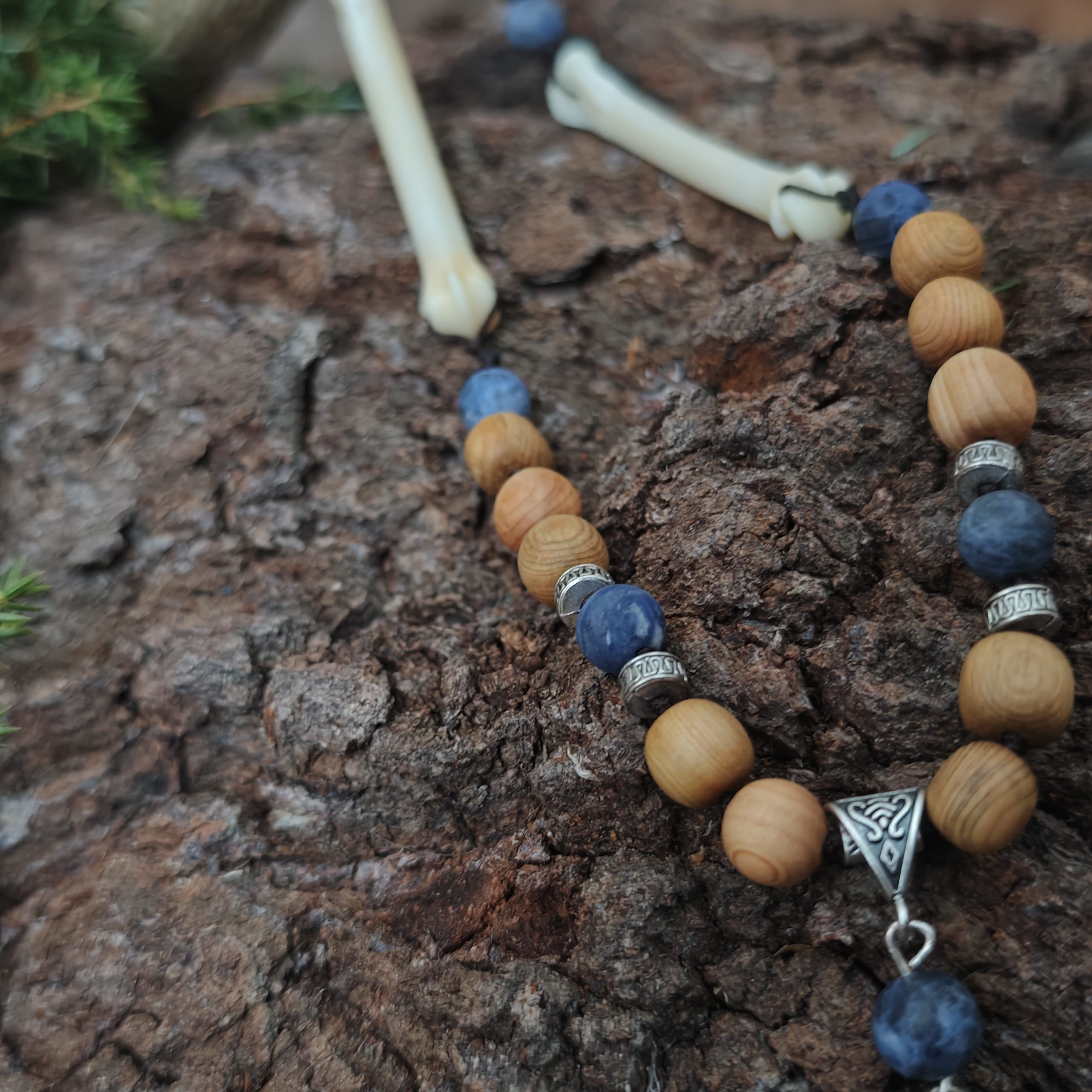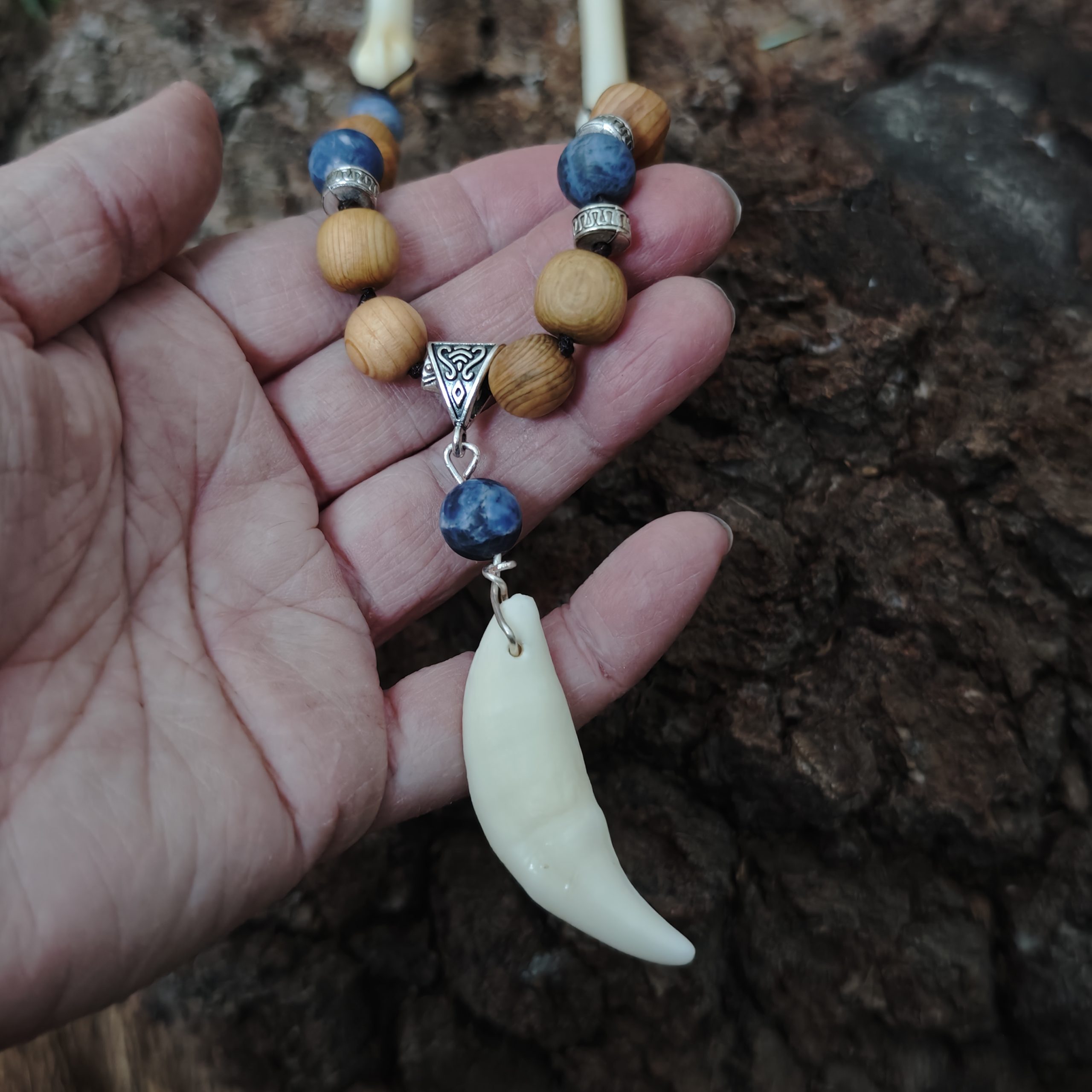 Kadakapuit, hundiluu ja kihv, sinine sodaliit nagu kadakamarjad. Väekee pikkus kaelas 32 cm( kogupikkus 64 cm), lisaks kihv.
