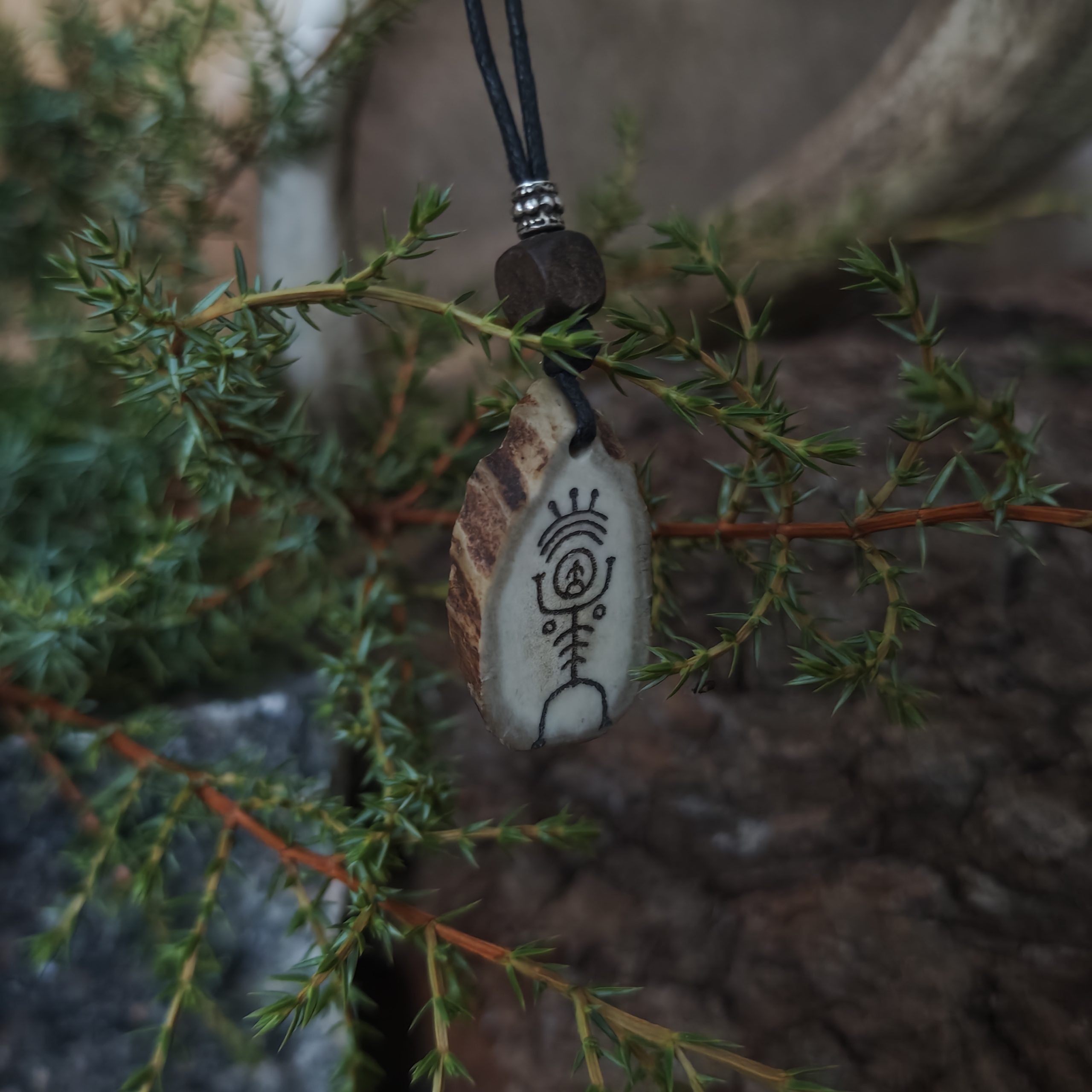 Põdrasarvele põletatud šamanistlik sümbol. Maa ja taeva ühendus, kõrgema vaimu ühendus. Reguleeritav pael.
