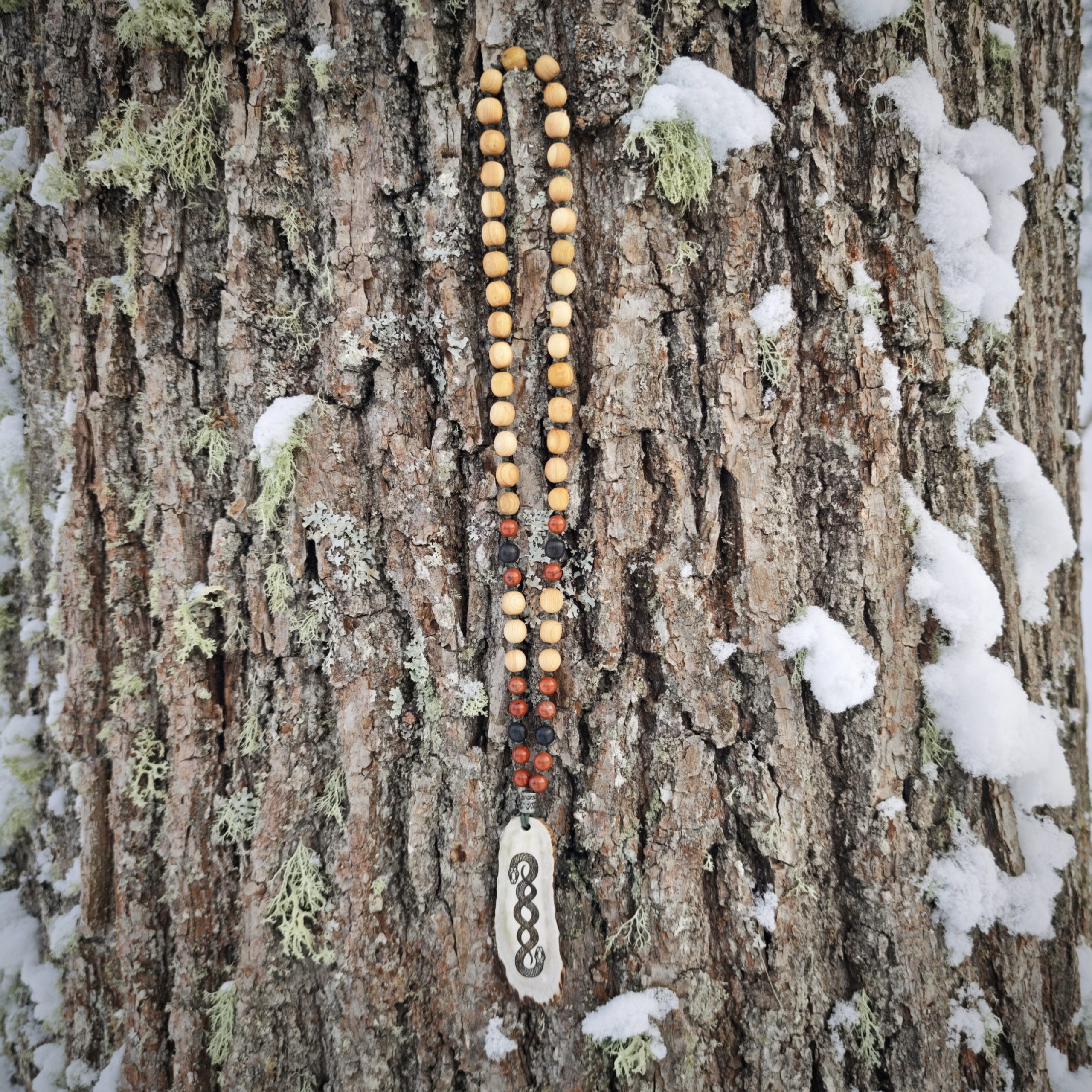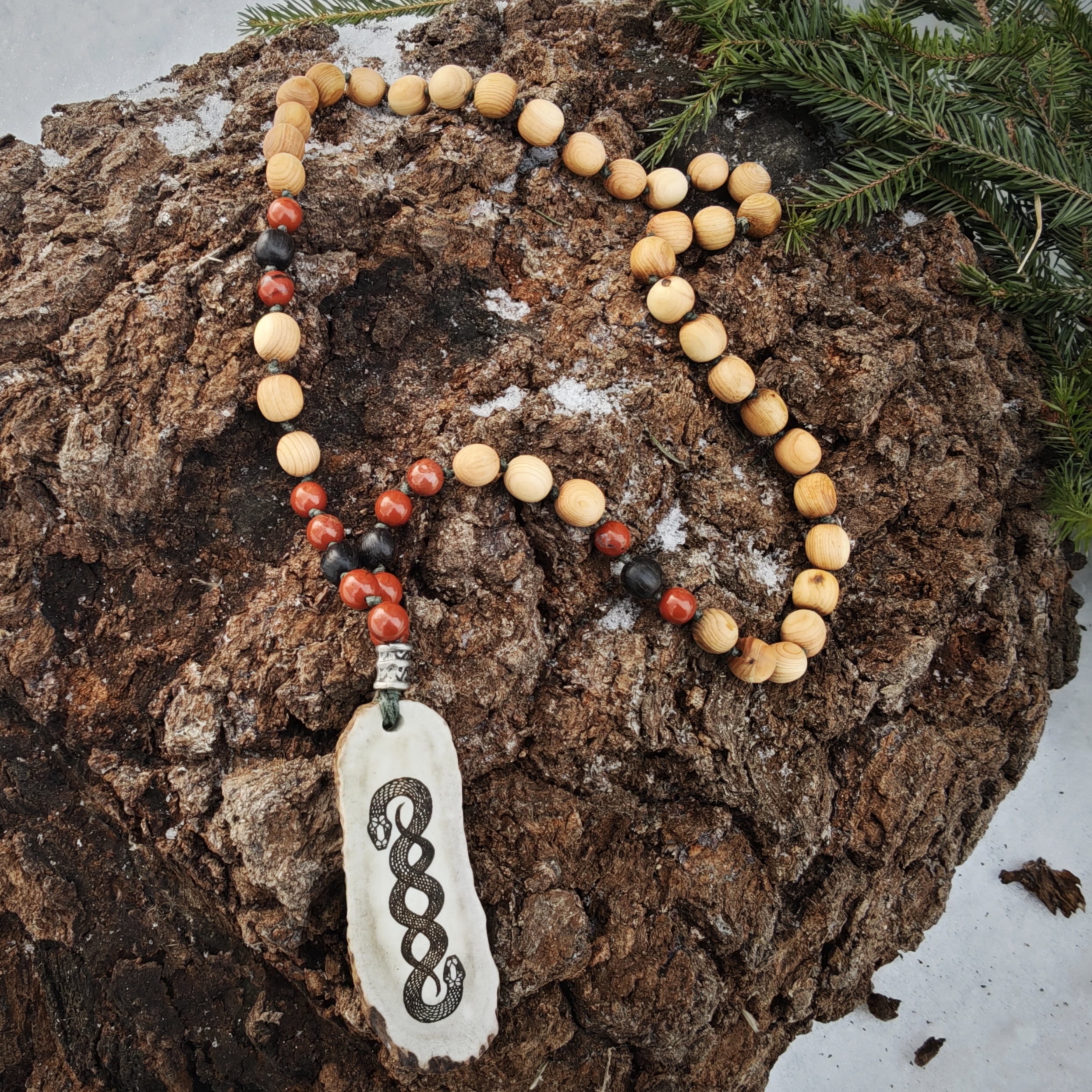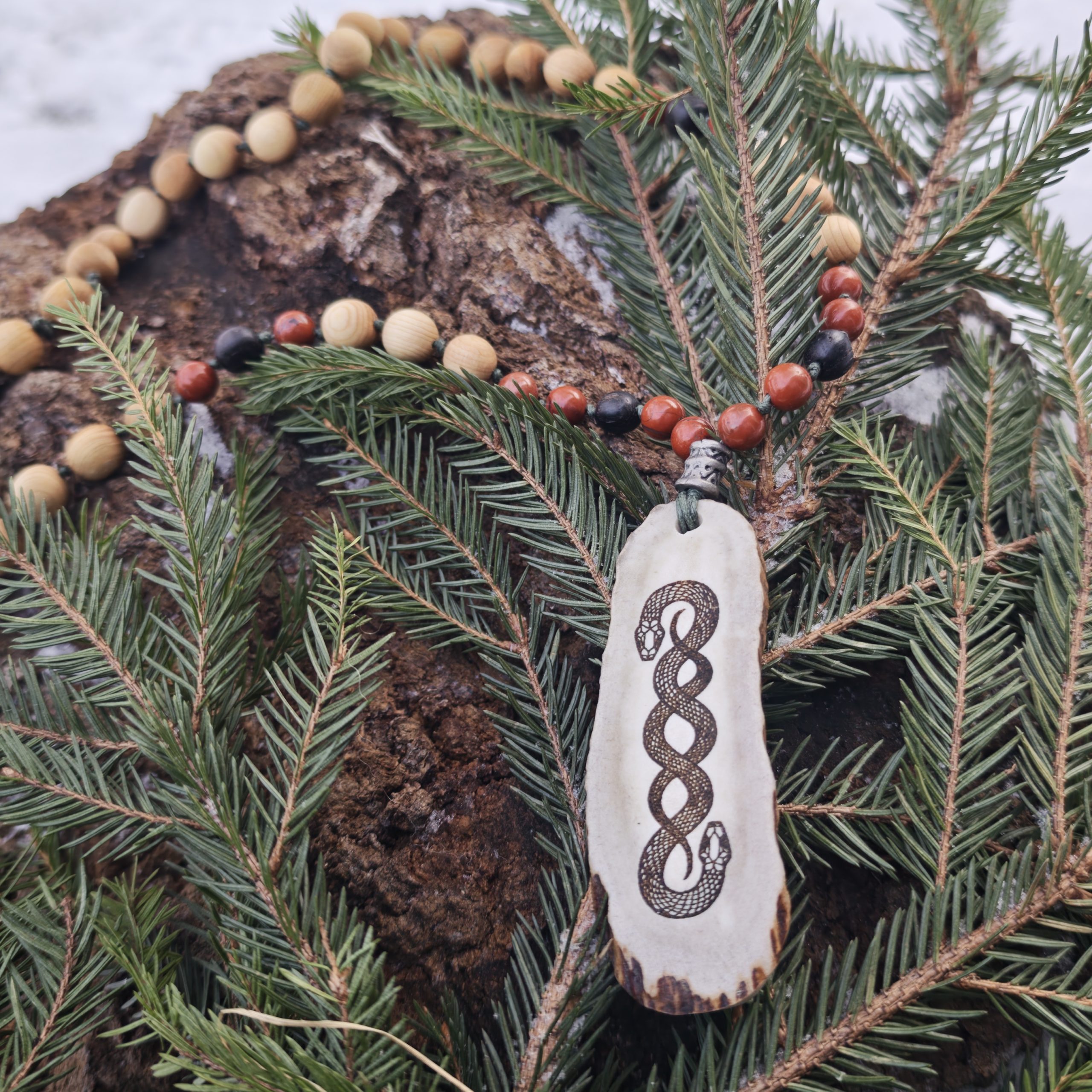 Kaks põimitud ussi sümboliseerivad duaalsust, alumist ja ülemist ilma, maaväge, muutusi, maagiat, armastust ja hoitust. Ussid on põletatud põdrasarvele. Väekees on kadaka, musta tamme ja punase jaspise helmed. Helmeste osa pikkus kaelas ca 34 cm (kogupikkus 64), sarveripatsi pikkus 9 cm.